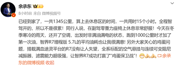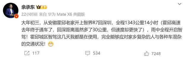 回家是享界S9,这次返程是智界R7,从安徽霍邱出发,全程高速,一共1314公里,耗时15小时。“全程智驾,所以不是很累!同行人说,在副驾零重力座椅上休息非常舒服!”,余承东还称,雨中全程智驾,霍邱城区智驾这几天都在使用,完全能够应对家乡复杂的人和各种车混杂的交通状况。这说明余承东除了回老家高速上是用的享界S9,到老家后普通路面都在使用智界R7,包括这次返程。