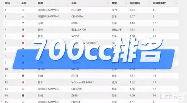 该级别中本田NC750X以3.33升的绝对优势位居第一,紧跟其后的是街车版无极650R为4.06升。而其他车型基本上都在4.5升左右浮动。