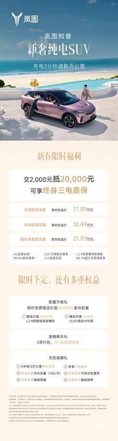除了全新梦想家,新奢纯电SUV——岚图知音也参加了本次活动。岚图知音以出色的性能和智能配置,成为年轻家庭的理想选择。新年期间,岚图知音推出新春限时福利,交2,000元抵20,000元,可享终身三电质保。长续航智享版、长续航超充版和超长续航智享版的限时权益价分别为17.89万元、18.49万元和21.89万元。此外,岚图还为消费者提供了配置升级礼、金融购车礼和无忧保障礼等多重福利。其中,配置升级礼包括限时免费赠送价值30,000元的豪华配置,如L2.9级智能驾驶辅助和OLED曲边中控屏;金融购车礼包括0首付起,12-60期超低息;无忧保障礼包括5年或10万公里整车质保、终身三电质保、终身免费车机流量(10G/月)、终身免费可预见性服务、终身免费道路救援和免费首次基础保养。
