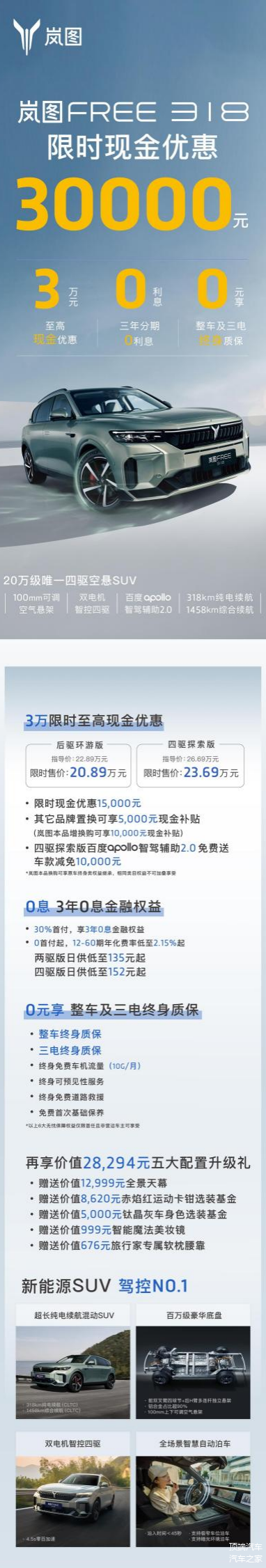 岚图 FREE 318作为一款中大型增程式SUV,凭借其出色的性能和豪华配置,赢得了广大消费者的青睐。在新年之际,岚图 FREE 318推出限时现金福利活动,至高可享30,000元现金福利,后驱环游版和四驱探索版的限时售价分别为20.89万元和23.69万元。此外,岚图还为消费者提供了0息金融权益,30%首付即可享受3年0息,0首付起,12-60期年化费率低至2.15%起,两驱版日供低至135元起,四驱版日供低至152元起。同时,岚图还提供整车及三电终身质保、终身免费车机流量(10G/月)、终身免费道路救援等无忧保障权益。购买四驱探索版的用户,还可免费获得价值10,000元的百度apollo智驾辅助2.0系统。