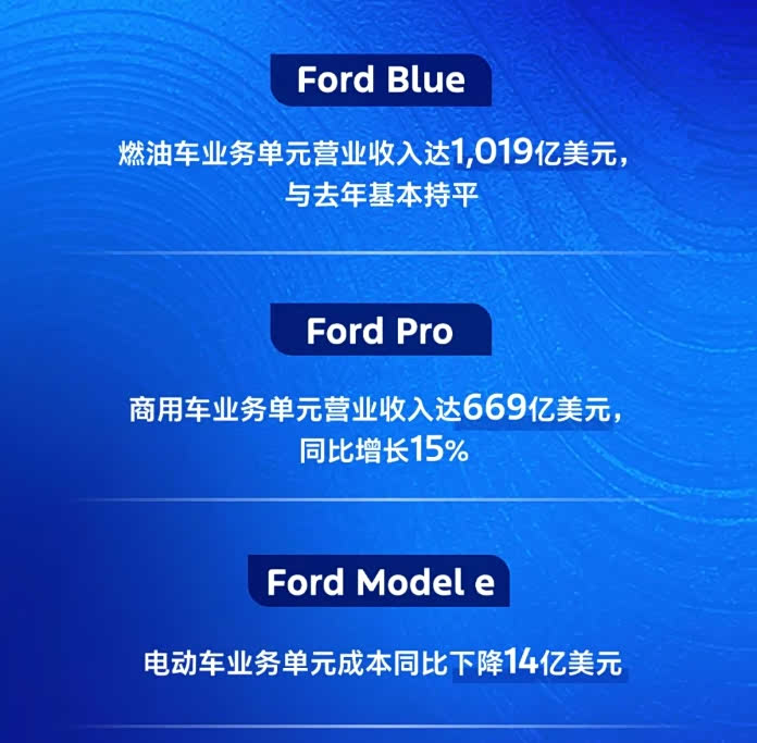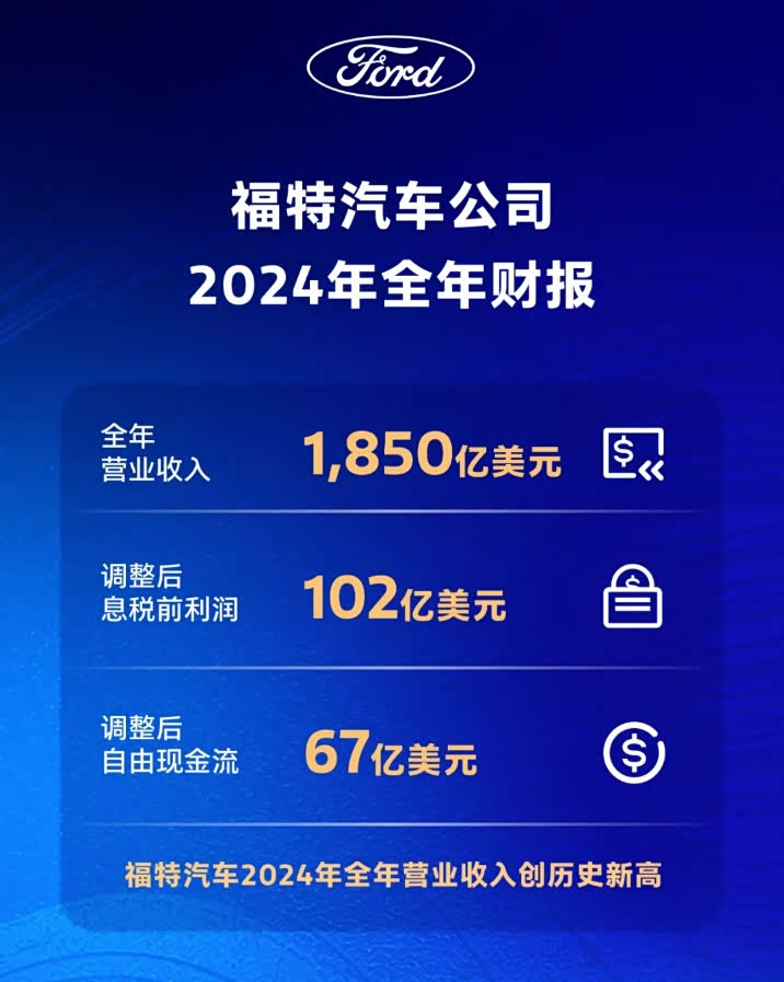 7年来首次全年盈利,福特中国总裁业务范围扩大 2月7日,福特汽车公司宣布,福特中国总裁兼首席执行官吴胜波在现有职责范围基础上,兼管福特汽车国际市场集团业务。 吴胜波于2022年10月加入福特中国,担任福特中国总经理兼首席运营官;2023年3月任福特中国总裁兼首席执行官。随后,其推出福特中国业务战略:聚焦具有竞争优势的核心业务,充分发挥福特旗下具有标志性的产品的优势;通过与中国产业链合作,开发本土化新能源车型;拓展福特中国的整车出口业务。 新战略推出后,福特中国在2023年第三季度实现扭亏为盈,并连续6个季度盈利,2024年实现7年来首次全年盈利。 福特中国2024年全年出口汽车近17万辆,同比增长超60%,东南亚、中东和南美是出口的主要市场。 福特中国与中国产业链合作伙伴共同开发的新能源产品预计在今年内亮相。 2024年,福特汽车全年营收1850亿美元,调整后息前利润为102亿美元。燃油车业务营收1019亿美元,与2023年基本持平;商用车业务营收669亿美元,同比增长15%。此外,电动车业务成本下降14亿美元。