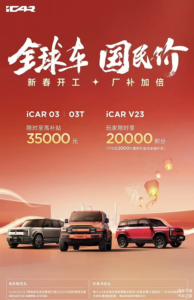 比较难得的是,作为成立不到2年的全新品牌车型,这一次也释放了很大的优惠力度,iCAR 03/03T车型至高补贴3.5万,iCAR V23的用户限时享受2万积分,相当于2000元金融补贴。