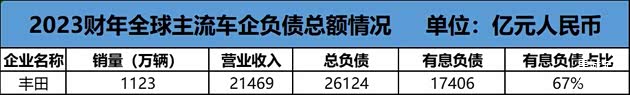 再说说丰田,丰田2023年营收2.1万亿元,总负债2.6万亿元,有息负债更是占总负债的67%,高达1.7万亿元。丰田虽然市场需求比较稳定,信用评级也不错,但这么高的有息负债就像一颗定时炸弹。一旦市场有点风吹草动,或者利率上升,财务压力就会剧增。