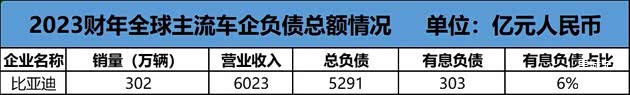 说完国外的,再看看咱们国内的比亚迪。2023年比亚迪营收6023亿元,总负债5291亿元,有息负债只有303亿元,占比仅6%。从数据上看,比亚迪的负债结构就健康多了。虽然负债率看着不低,但大部分是无息负债,像应付账款之类的。这说明比亚迪在产业链上的话语权越来越强了,供应商愿意给它提供较长的账期,经销商也愿意提前打款订车,这就是实力的体现。