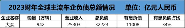 先看大众,2023年大众集团营收2.5万亿元,可总负债竟然有3.2万亿元。这负债比营收还高啊,相当于你挣1块钱,还背着1块多的债呢。而且大众有息负债1.1万亿元,占总负债的34%。这么高的有息负债,利息支出可不少,利润空间都被挤压了。大众为啥负债这么多?它的金融服务业务是个大源头,这部门看着能赚钱,但也带来了大量债务。