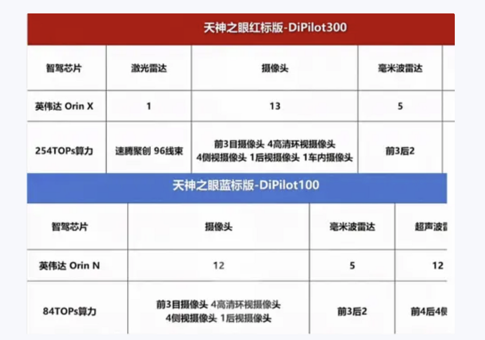 一图看懂比亚迪天神之眼智驾“红标”和“蓝标”区别。 “蓝标”是DiPilot 100(便宜的),采用英伟达Orin N芯片,支持高速和城市快速路智驾; “红标”是DiPilot 300(贵的),采用英伟达Orin X芯片,搭载激光雷达,支持城区智驾(L2+)。
