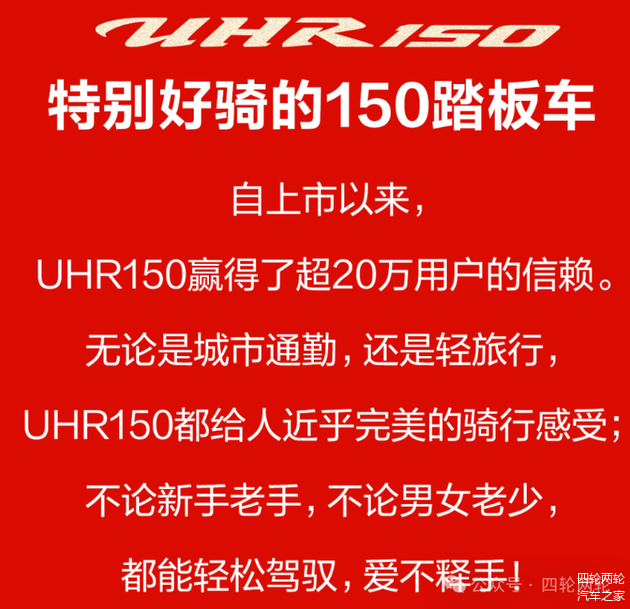 该车搭载单缸水冷150CC引擎,最大功率10.6千瓦,最大扭矩14.2牛米,这台发动机实际骑行表现,也正是UFR150行驶品质的保证,骑过UHR150的兄弟们都知道,这台发动机无论是动力、震动、还是燃油经济性都表现的十分优秀,在可靠性和质量稳定性方面,更是公认的第一。正是因为上述优异表现,该动力平台已收获超20万用户真金白银的青睐!
