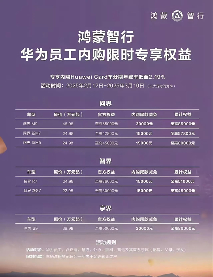 【鸿蒙智行员工福利价格来了,最高优惠8.5万!】 鸿蒙智行给华为员工推出的限时专项权益,问界M9累计权益8.5万,M7累计权益5.78万,M5累计权益6万! 智界R7累计权益5.1万,智界新S7累计权益4.5万,享界S9累计权益8万!