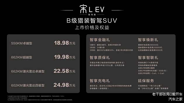 2月10日比亚迪宣布王朝/海洋全矩阵车型升级为“智驾版”车型,具体到单车,除10万不到可以买到天神之眼C很受关注外,较高定位车型提供天神之眼B则是另一个焦点。代表车型就是主打运动+猎装设计的宋 L EV智驾版。新车价格区间是18.98万-24.98万元,精简了产品谱系,不仅全系高阶智驾,且中高配车型搭载规格更高的天神之眼B - 高阶智驾激光版(DiPilot 300)。