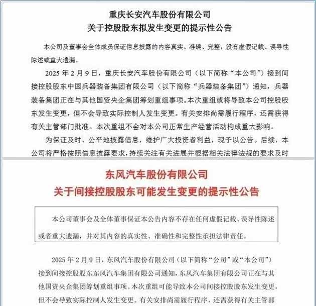 2025年2月9日晚,汽车圈被两则公告“炸”上热搜。东风汽车股份有限公司与重庆长安汽车股份有限公司同时发布公告称,其间接控股股东——东风汽车集团与中国兵器装备集团(兵装集团)——正在与其他国资央企筹划重组事项。尽管公告未明确双方互为重组对象,但时间点高度重合、内容一致,业内普遍认为这是两大汽车央企合并的“前奏”。