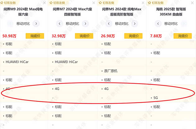 然而,比较意外的是目前鸿蒙智行的销售主力问界在售的三款车型中,从问界M5到问界M9居然没有一款车型配备5G网络。反观比亚迪售价7万多的海鸥智驾版,就是配备了余承东所说的5G网络。