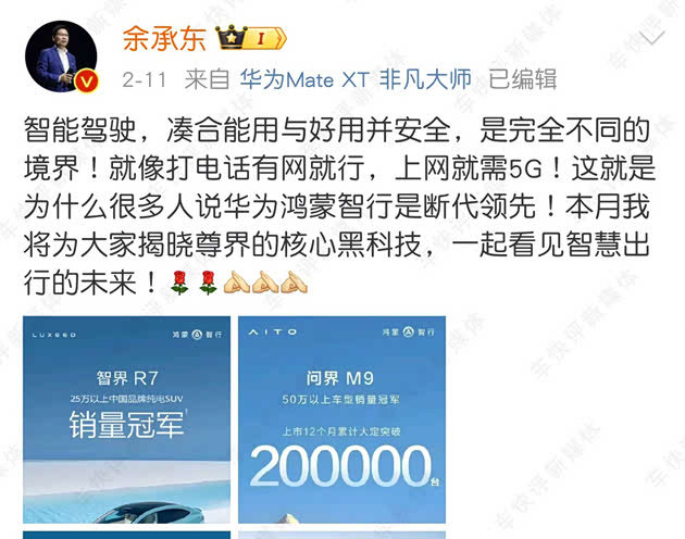 在2月11日,余承东在社交平台发文表示智能驾驶凑合能用与好用并安全是完全不同的境界,就像打电话有网就行上网就需5G,还不忘夸自家的鸿蒙智行是断代领先。