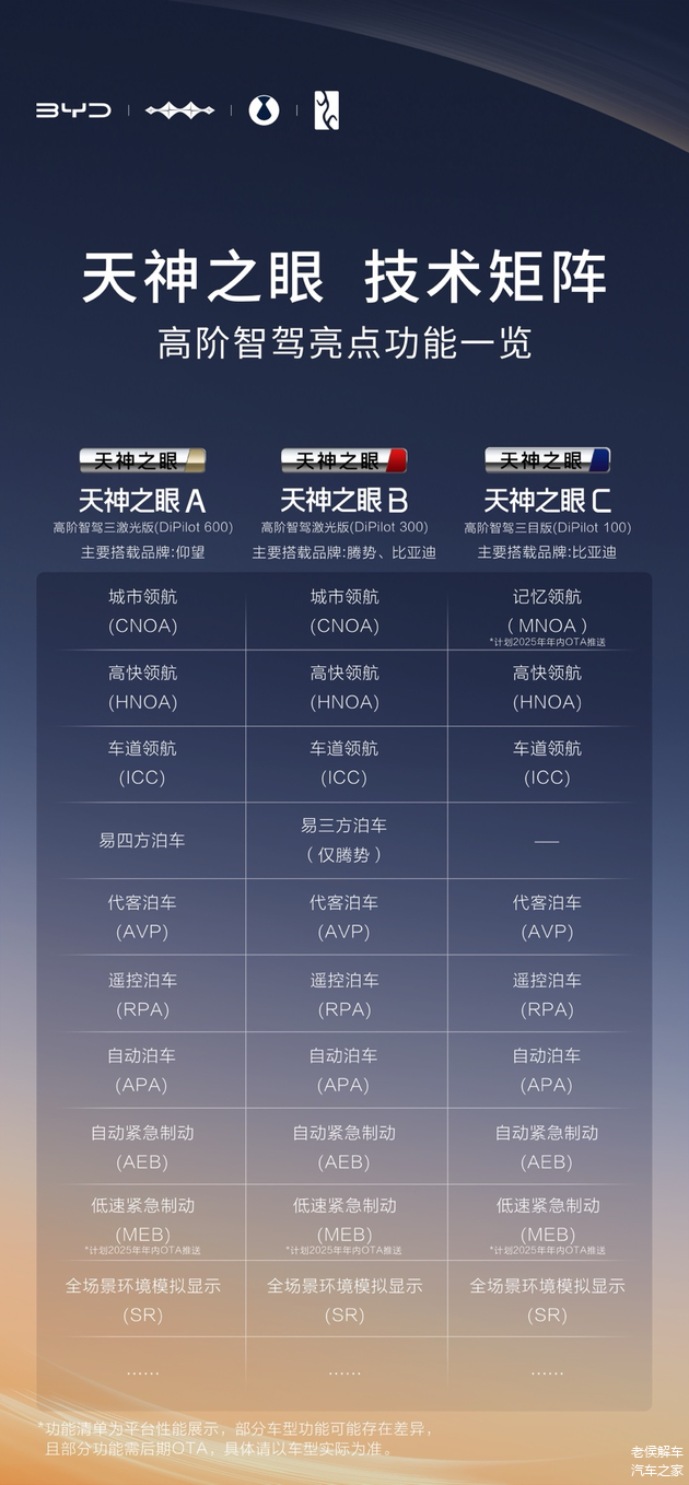 (3)天神之眼C-三目版:以高于行业的标准推动智驾技术普惠,覆盖比亚迪主流车型(7万-20万级),采用前视三目5R12V12U方案,支持高速领航、记忆领航(25年内OTA)、代客泊车等智驾功能,全系“加配不加价”。