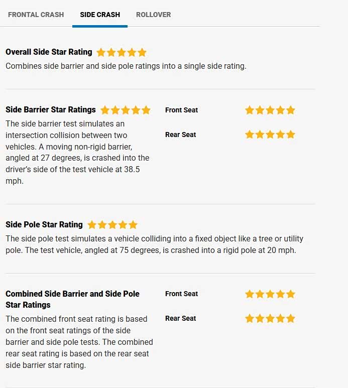侧碰没什么好说的,台车和柱撞的各个单项都是五星;