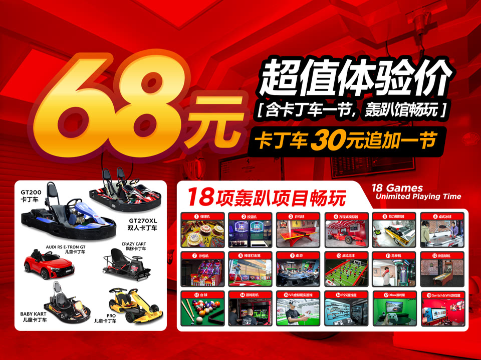卡丁车 + 轰趴馆 = 仅需68元!!!! 金港秋名山GT乐园轰趴馆拥有北京唯一一条室内外双层立体赛道,总长度达460米。数十项轰趴游乐设施和“头文字D”主题餐厅让每⼀位前来品尝美⻝的车手重新充满活力,一路在赛道上驰骋。#金港秋名山GT卡丁车场#