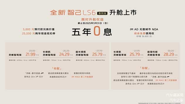 除了极具吸引力的价格,购车还可享超多诚意权益。即日起至 3 月 31 日前完成大定,可享 5 年 0 息金融政策,日供低至 83 元,大大减轻了购车的经济压力 。官方还赠送价值 36800 元的 IM AD 无图城市 NOA 终身免费使用权,让用户能够长期享受先进的智能驾驶辅助带来的便利 。此外,还有终身免费流量 5G / 月、5 年 / 15 万公里整车质保、8 年 / 24 万公里三电质保、免费质保道路救援等权益,从购车到用车,全方位为用户保驾护航,让用户购车无忧,尽情享受智己 LS6 剧院版带来的卓越出行体验。