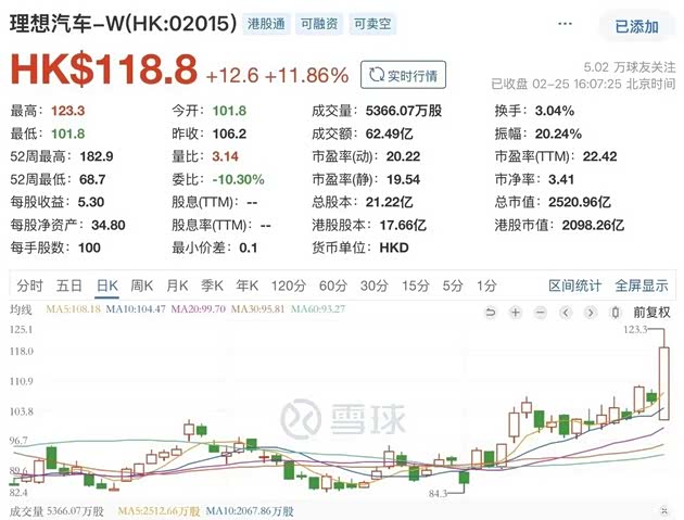 理想i8仅凭车头与车尾两张图片,就赢得了网友们的广泛赞誉,这与之前首款纯电MPV MEGA发布时围绕造型的争议形成了鲜明对比。这一积极的反响迅速提振了理想汽车的股价,使其从长期的低迷中走出,收盘时股价上涨11.86%,收于118.8港币,盘中市值更是一度飙升超过360亿港币。可以说,理想i8的发布标志着理想汽车成功摆脱了MEGA带来的阴影。
