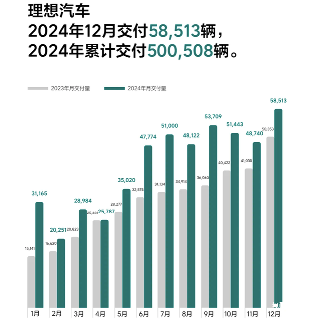 2024年12月31日晚,理想汽车直播见证了年销量突破50万辆的历史时刻。尽管这一成绩与年初设定的80万辆目标尚有差距,但理想在第一季度财报发布时已较为务实地将年销量目标下调至60%-70%。据统计,理想汽车12月单月交付量达到58513辆,全年累计交付量达到500508辆,同比增长33%。