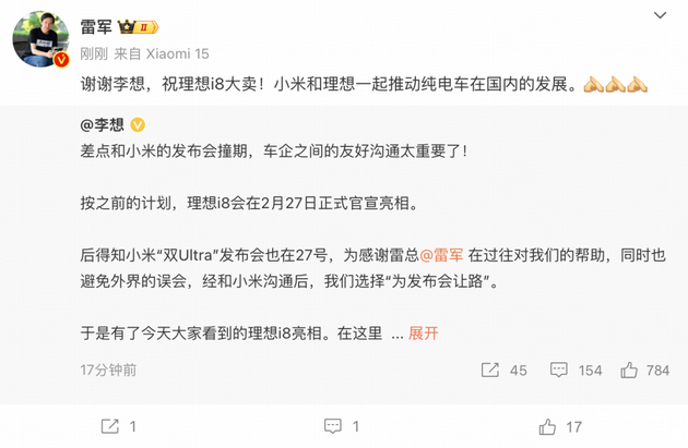 这次提前发布,背后有着一段有趣的故事。原本,理想i8计划在2月27日正式亮相,但恰好与小米SU7 Ultra的发布会撞期。得知这一情况后,理想汽车CEO李想出于对小米及雷军过往支持的感激,同时也为了避免外界可能的误解,主动与小米沟通,最终决定“礼让”发布会日期,于2月25日率先推出理想i8。雷军对此表示了感谢,并预祝理想i8大卖,强调小米与理想将携手推动国内纯电动车市场的发展。