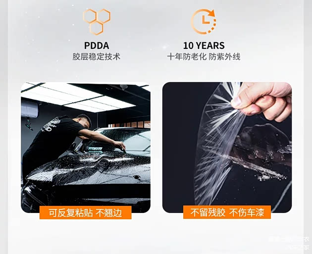 胶水是隐形车衣与车身漆面紧密结合的关键。劣质胶水不仅会导致车衣粘贴不牢固,容易脱落,还可能在撕下时损伤车漆。因此,在选择隐形车衣时,一定要关注其胶水的质量。智博士隐形车衣采用的是亚什兰胶层和PDDA稳定技术,粘贴牢固,在需要更换车衣时,也能轻松撕下,不会对车漆造成任何伤害。