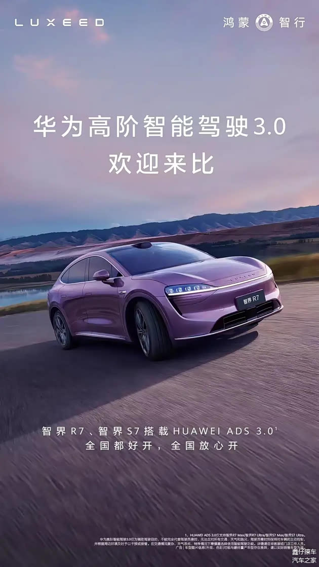智界汽车在官方微博上发文表示,华为高阶智能驾驶3.0欢迎来比!在预热海报显示, 智界R7、智界S7搭载HUAWEI ADS 3.0,宣称“全国都好开,全国放心开”。