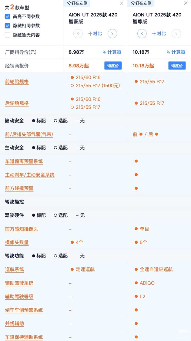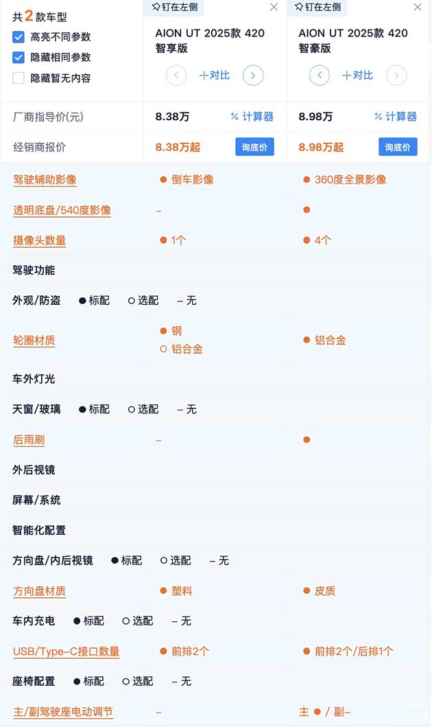 一款8.38万元,另一款8.98万元,两款车差价在6000元。那么配置上差了什么呢?