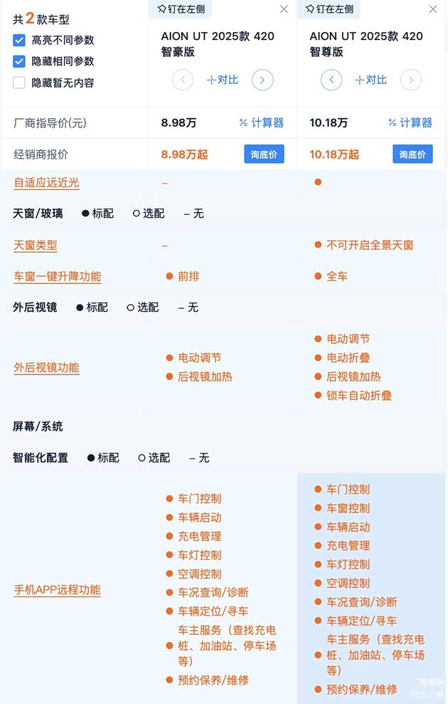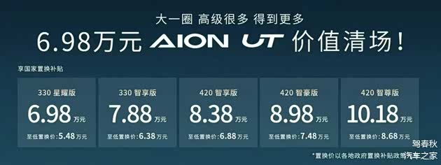 330km版本:星耀版>智享版;420km版本:智享版>智尊版>智豪版。