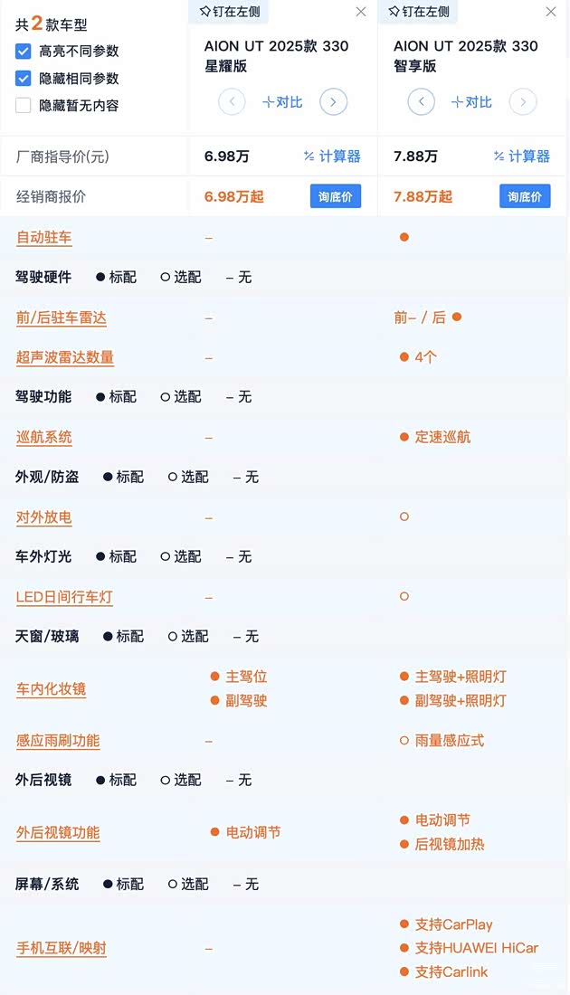 我们先来看入门版车型——星耀版和次入门版车型——智享版应该怎么选。价格来看,星耀版售价6.98万,智享版售价7.88万元,两款车型差价9000元。那么配置上相差了什么?