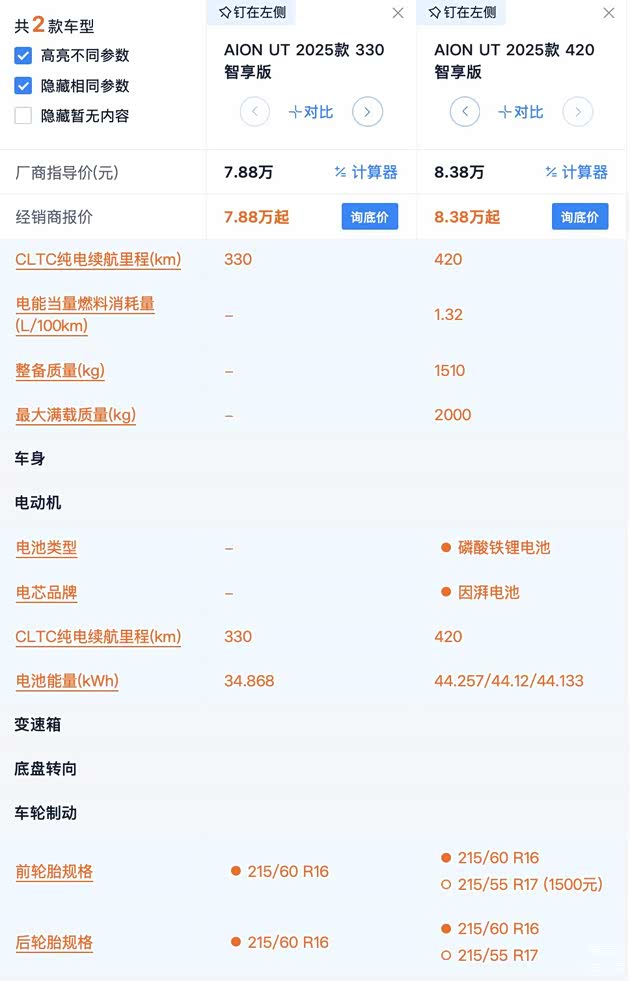 价格来看,330km顶配的智享版价格7.88万元,420标配的智享版价格8.38万元,二者差价只有5000元。那么要选谁呢?