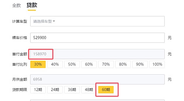 有人会说了,现在谁买车还用全款的方式,我们都是用贷款,贷款买车,没问题,我也一样给大家准备好了计算器了,首先,我们把贷款首付比例拉到最低的30%,也就是158970元,而贷款期限直接拉到最高的60期,也就是5年时间,这时候,车主你一个月只需要6958元就可以养得起这辆车了,但问题是你养得起吗?普通人谁敢说自己每个月能拿得出6000多的可支配资金?