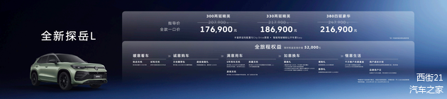 3月1日,一汽-大众全新 探岳L在泰山正式上市。新车推出300TSI、330TSI、380TSI三种动力配置,共3种车型,官方指导价20.79万元起,可选装City包和Easy包。现购车可享17.69万元起的全款一口价。