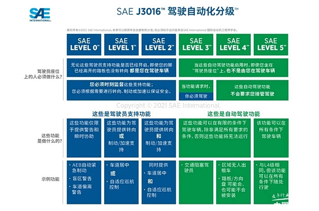 此前,关于驾驶辅助的分级,行业内大多数都以美国汽车工程师学会(SAE)在2019年所发布的标准作为参考。在该标准下将车辆的智能驾驶能力分为了“L0—L5”共6级,其中“L0—L2”属于驾驶辅助的范畴,而“L3—L5”则属于自动驾驶的范畴。