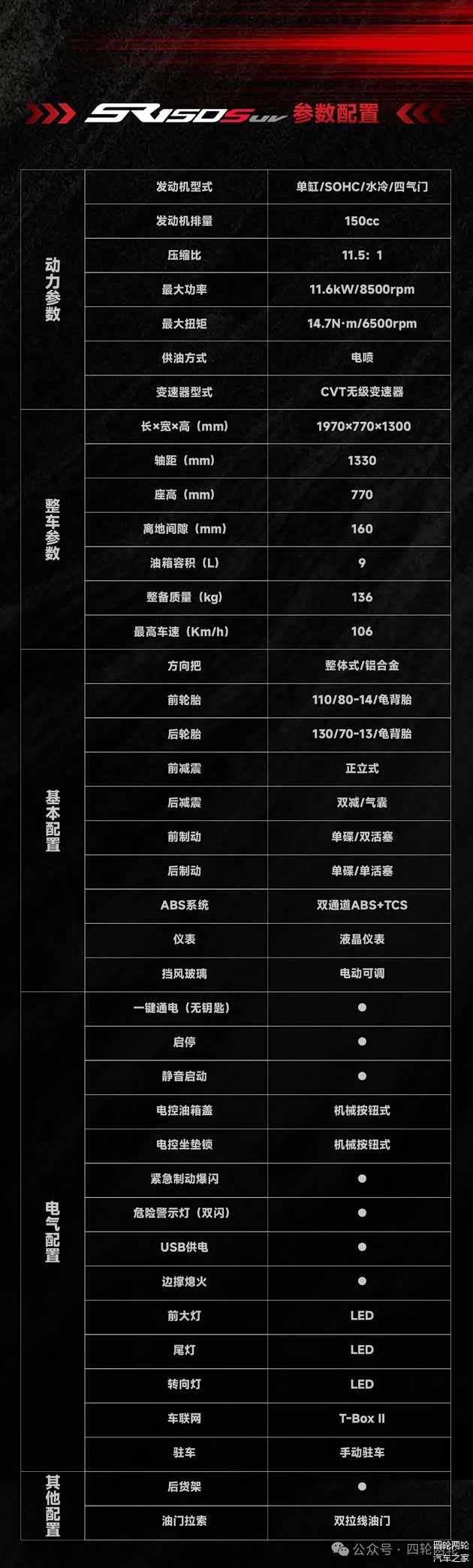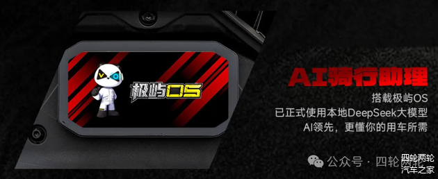 配置有双通道ABS+TCS,无钥匙启动,电动风挡,液晶仪表,USB充电接口,边撑熄火,全车LED灯源,T-BOX车联网功能,手动驻车等配置,值得注意的是,SR150S还搭载了使用本地DeepSeek大模型的极屿OS系统,在AI智能化方面,无极也一直走在国产品牌的最前面。