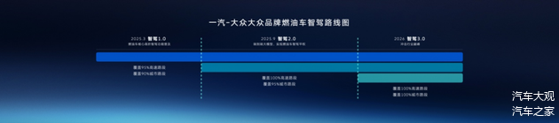 为了顺应燃油车智能化的发展,一汽-大众还制定了“燃油车三步走”的智驾路线图。第一步是当前的1.0阶段,普及燃油车核心高阶智驾功能,覆盖全国95%高速路段和90% 城市路段。第二步是要在今年第 36 周开启智驾2.0阶段,实现端到端大模型上车,可覆盖全国 100% 高速路段和 95% 城市路段。第三步是在2026年开启智驾3.0阶段,将智驾功能实现覆盖全国 100% 高速路段和 100% 城市路段。