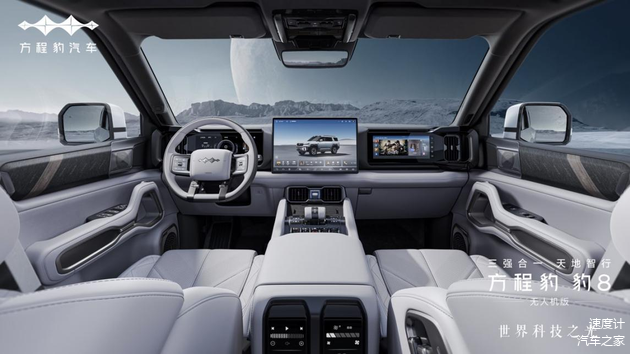 在外观设计上,豹8无人机版同样不负众望。车顶加装了智能机库及4K高清超广角车顶摄像头,科技灰配色结合机甲风的外观设计,让整车看起来更加集成、轻盈,尽显未来智慧科技风范。同时,豹8无人机版还新增推出了专属限定内饰色——雪峰白,以纯净冰川美学打造专属操控空间,让用户在驾驶过程中也能感受到来自大自然的宁静与美好。