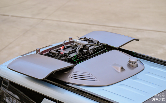 该“灵鸢”系统由智能机库、车载无人机、车顶摄像头和灵鸢APP四大组件构成。其中,智能机库提供悬浮式(换电版)和内嵌式(快充版)两种装车方案。其集成了车规级风速计、车载无人机定位模块、图传天线、车顶摄像头以及智能温控系统,具备动态起降、精准降落、智能充电和温度控制等多项功能。