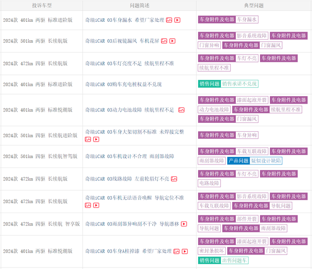 而根据车质网公布的信息来看,有不少车主针对iCAR 03续航缩水的问题进行了投诉,然而话说回来,如果你只是把它当作城区代步车,续航缩水的问题还能忍,不过还有一些不能忍耐的事情,就是车辆的品控问题,比如有大量iCAR 03车主反馈车辆还存在车身异响、车身漏水,甚至是部件开裂等多个质量问题。