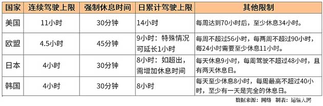 国际经验表明,各国对疲劳驾驶的管理有两点共性:严格标准与人性关怀。欧美日韩等国普遍细化时间限制,除单次驾驶时长外,多数国家设置每日/每周累计驾驶上限,并规定强制休息时间。