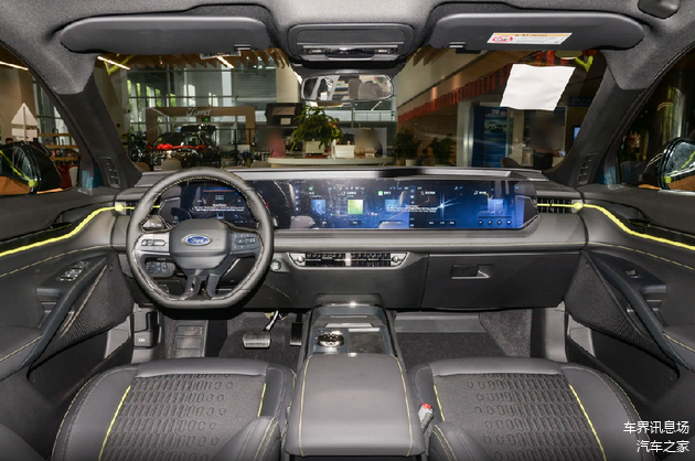 来到蒙迪欧混动版的座舱,大面积黑色元素中间夹杂着黄色饰条点缀,赋予车辆很强的运动气息。平底式方向盘两侧的多功能按键手感尚可,操作起来简单又方便,正前方的一体屏由12.3英寸+27英寸组成,从主驾驶位一直贯穿到副驾驶位,视觉冲击力直接拉满。触控屏内搭SYNC+2.0车机系统,卫星导航、OTA升级以及车联网等常规配置均没有缺席,基本符合主流用户的使用需求,但需要注意的是,由于蒙迪欧的屏幕尺寸过长,所以驾驶员操作最右侧的屏幕并不是那么方便。大屏幕的设计有效提升座舱智能化,但操作便利性受影响,此处还有优化空间。