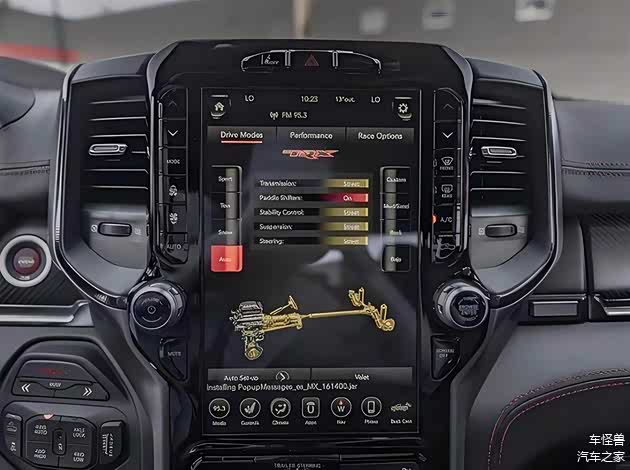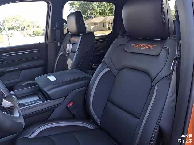 车里的设计彻底改变了人们过去对皮卡车的粗旷和不够精美的看法。这款车采纳了黑与红的配色方案,并在车内使用了高档的布料、皮革和绒面革进行铺设。前面的座椅配备了两个独立的真皮沙发,宽大的侧翼和丰富的填充材料,背部不仅有红色的装饰条,还有“TRX”红色的刺绣图案。这也为您提供了豪华SUV的驾驶感受。虽然后排座椅的背靠部分看起来相对直立,但经过适当的填充处理,它也不会让人感到太过不适。中控台上装有一个带有羊头标志的四辐式多功能方向盘和换挡拨片,而操作岛区域则配备了真皮覆盖的金属换挡手柄和后方的手套箱。在科技方面,这款车搭载了一块12英寸的大型竖屏显示器和8英寸的半液晶仪表,这些功能都支持蓝牙、导航以及车载Wi-Fi、CarPlay和Android Auto手机的映射功能。底部还维持了大量的物理按钮,为其增添了更强烈的机械触感。