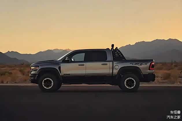 道奇公羊霸王龙TRX的车身设计展现了独特的创意,其双排的长货箱体现了其实用性和霸气。车辆的前半部分采用了黑色的硬塑料进行装饰,车窗的装饰条与隐私玻璃完美结合,黑色的侧裙、轮拱和迎宾踏板,给人一种身穿铠甲的战士的感觉。轮眉的下方装配了18英寸的黑色铝合金轮圈,并搭配了325/65R18的AT全地形轮胎,这种宽胎的设计不仅视觉冲击力大,而且越野性能也非常出色。从车身尺寸来看,霸王龙皮卡的长、宽、高分别达到了5936/2235/2088mm,而其轴距更是高达3687mm。在越野能力上,其最小的离地距离为280mm,接近角为30.2°、离去角为23.5°、通过角为21.9°,展现出了卓越的越野性能。车辆内部设计了五个座位,并配有真皮制成的宽敞沙发,这使得无论是载人、货运还是越野冒险,都能毫不费力地应对,充分展示了其多才多艺的一面。