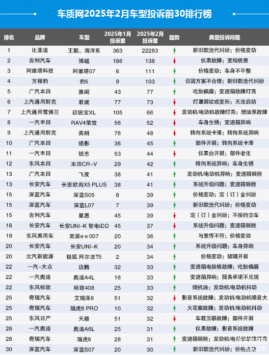根据车质网最新数据,2025年2月共受理车主有效投诉39985宗,环比暴增2.37倍,同比上涨1.6倍,刷新历史纪录。其中,自主品牌投诉量占比高达85.1%,较1月提升33.6个百分点,首次从“质量问题”转向“服务纠纷”。比亚迪、吉利、深蓝等品牌因新旧款迭代争议、价格波动等问题引发大规模投诉,成为榜单主力。