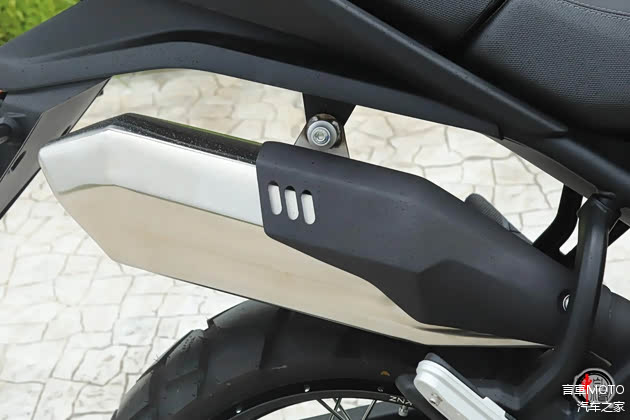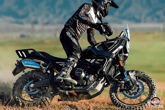 2025款车型采用全新黑武士风格涂装,配色并非简单喷涂——油箱、轮毂、车身等细节的哑光处理,阳光下呈现细微金属颗粒质感,营造出更强的力量感和冒险氛围。车头仿生蚂蚱造型争议颇大,同时也是亮点之一,复眼式LED大灯配合上翘的颚部线条,与传统鸟嘴ADV划清界限。不锈钢高位排气系统,搭配越野轮毂、辐条轮毂,硬核气息扑面而来。更为亮眼的设计当属油箱两侧可拓展护板,能抵御碎石飞溅,绝非简单装饰。