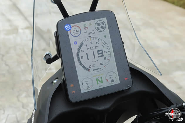 灯组的造型设计对于外观的也是加分项,头灯采用圆形LED光源,整体设计延续了家族化风格元素,这种复古与ADV相融合的设计,与传统鸟嘴ADV形成了鲜明的视觉差异,体大程度的提升了整车的辨识度。此外,车身两侧还配有辅助照明,能够满足夜间或低能见度条件下的行车需求。车机系统采用7寸竖型TFT全彩液晶仪表,标配车机互联、导航投屏等功能配置,提供丰富车辆信息的同时,提升了驾驶的便利性和安全性。
