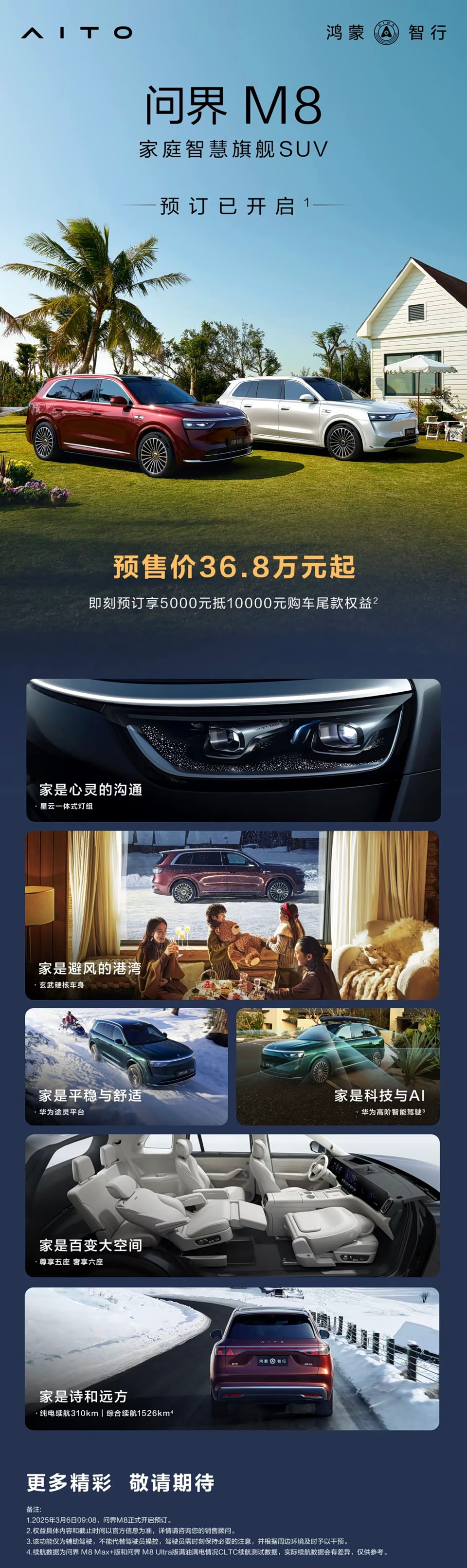 问界M8开始接受预订了,预售价格是36.8万元,下订还有5000元订金抵10000元购车尾款权益,估计落地价基本和理想L8一致。 现在鸿蒙智行对问界M8的定位是家庭智慧旗舰SUV,和问界M9的科技豪华旗舰有区别,相当于M8是家用、M9是商务更多。新车将在4月上市,这段时间恰好是理想现款和新款切换的周期,估计问界M8的起量会很快。
