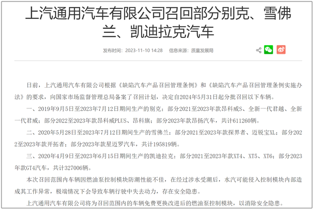 其实,自2024年5月31日起,上汽通用别克就宣布召回2019年9月5日至2023年7月12日期间生产的部分2021至2023年款昂科威S、全新一代君越、全新一代君威;部分2022至2023年款昂科威PLUS、昂科旗;部分2023年款昂扬汽车,共计611260辆。原因是,召回范围内车辆因燃油泵控制模块防潮性能不佳,在经过涉水受潮后,水汽可能侵入控制模块内部造成其工作异常,极端情况下会导致车辆行驶中失去动力,存在安全隐患。解决办法是免费更换改进后的燃油泵控制模块。