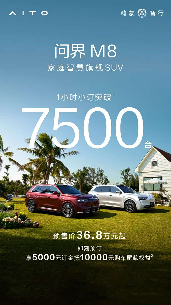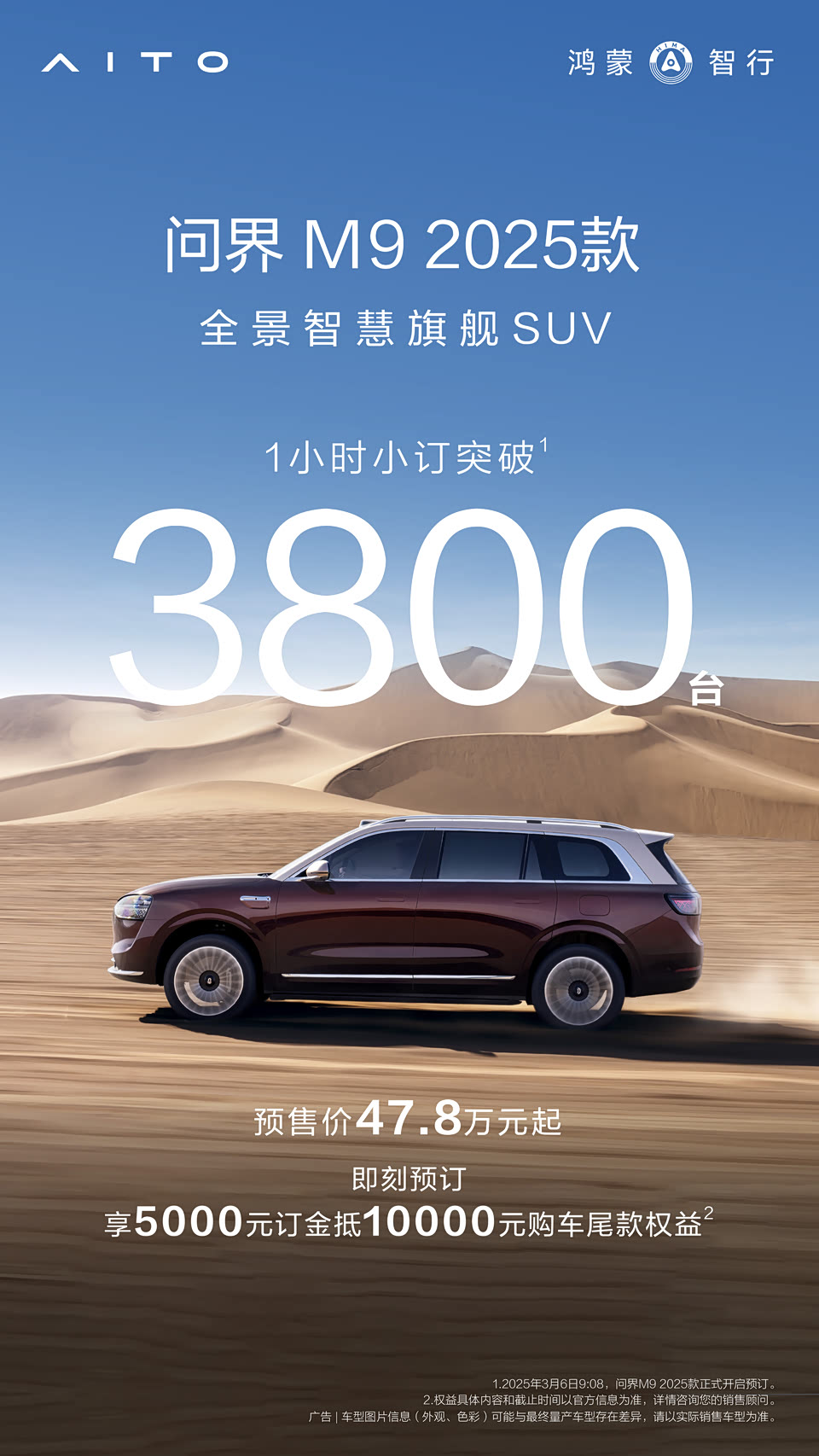 【新款问界M9预售价47.8万起】 按照官方海报,新款问界M9开启预售一小时之后的小订订单已经在3800+,即将在4月份上市的问界M8也拿下了1小时7500+小订的成绩。另外新款M9上新增的配置在老款上能升级出来,这点应该还是挺能让老车主心安的😎
