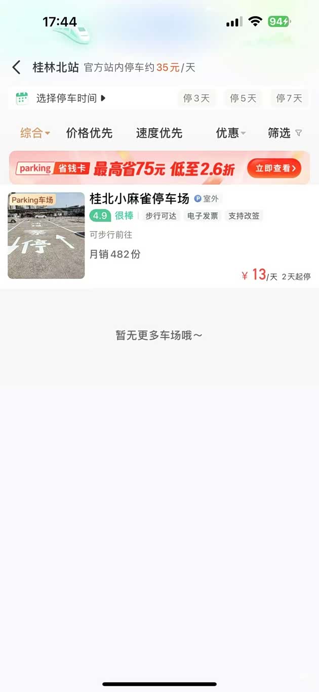 经常出入桂林北站的旅客们,是否在苦恼高昂的停车费?别担心,有个经济实惠的解决方案正等着你!除了站内停车场,你还可以选择通过网上预约附近的其他停车场。这些停车场价格亲民,每天仅需13元起,且离北站非常近,几步之遥,方便步行抵达。这样不仅能大幅降低停车成本,还能避开北站繁忙时段的停车难题。下次行程前,不妨上网比较一下价格,您只需关注并通过【小强停车】威信小程序上查看附近停车场,即可轻松预约周边的停车场,且输入邀请码58,还可领取38元停车抵扣券!