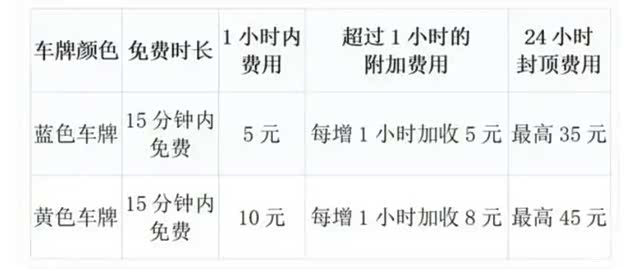 蓝牌车停车15分钟内免费,1小时内5元,之后每多停1小时加5元,24小时最高35元。黄牌车同样享受15分钟免费,1小时内10元,之后每小时8元,24小时最高45元。