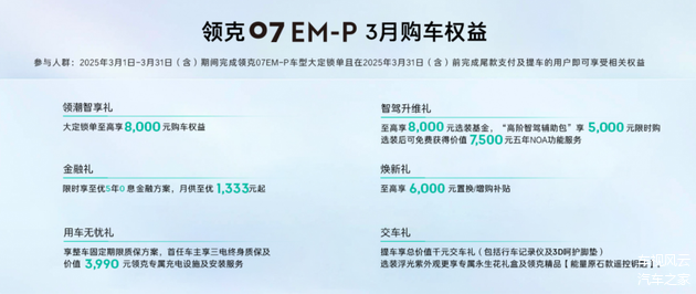 近日,我们通过领克汽车官方渠道了解到,领克07 EM-P车型的三月限时购车权益公布,其中将包含尾款抵扣、选装基金等,至高可省2.6万元,时间为3月1日-3月31日(含)。